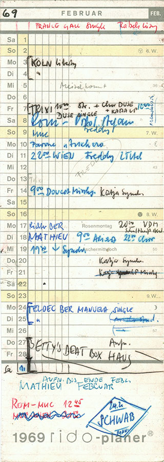 Hier das Original Kalenderblatt des Komponisten Christian Bruhn, mit entsprechendem Eintrag: